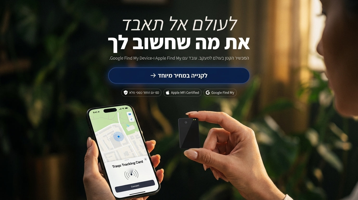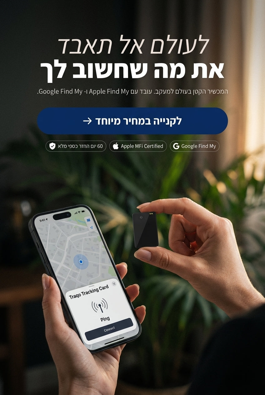 כן — Traqo עובד גם עם Apple Find My וגם עם Google Find My Device. מתאים לאייפון ולאנדרואיד כאחד.